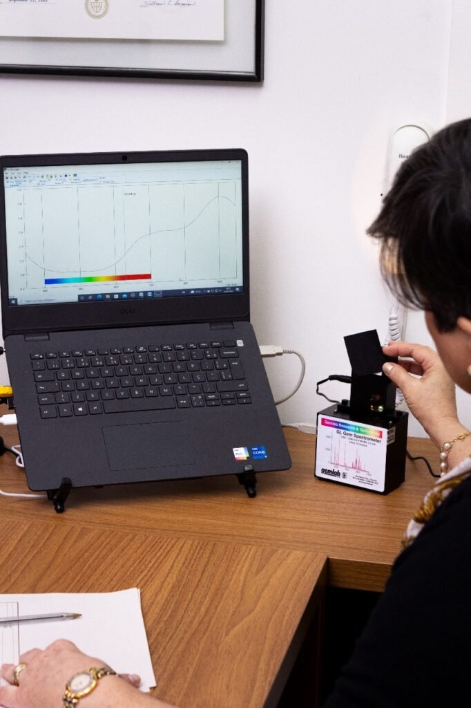 A pedra preciosa é minuciosamente examinada com instrumentos gemológicos para se obter a sua identificação. Informações como a procedência natural ou feita em laboratório e a presença de melhoramentos, bem como, informações de caracterização (cor, transparência, medidas, peso e estilo e forma da lapidação) e uma imagem são detalhadas no documento da gema.